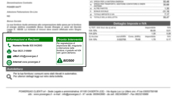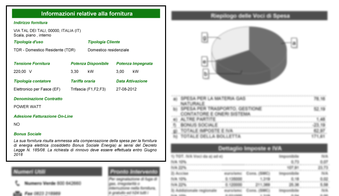 Qui vengono indicate le informazioni che caratterizzano la sua fornitura, come l’indirizzo dove è istallato il contatore, la tipologia d’uso, la tipologia di cliente, la tensione di forniture, la potenza disponibile e quella impegnata, la tipologia di contatore, la tariffa oraria, la data attivazione contratto, la denominazione dell’offerta sottoscritta, l’eventuale data di adesione alla fatturazione On-line, l’eventuale Bonus sociale.