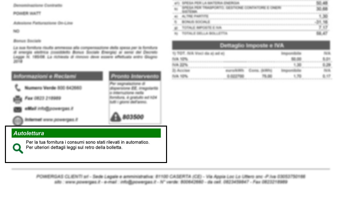 Qui viene indicato che la bolletta contiene un ricalcolo di consumi, o corrispettivi, già fatturati in precedenti bollette. Il ricalcolo, può dar luogo ad un saldo a debito o a credito del cliente, non annulla né sostituisce le bollette precedentemente emesse per i periodi oggetto della rettifica, salvo diversa indicazione da parte di Powergas.