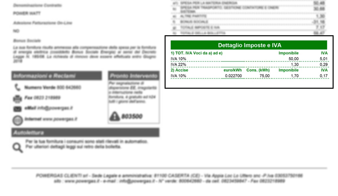 - Imposte e IVA: Riguarda le voci relative all’imposta di consumo (accisa) e l’imposta sul valore aggiunto (IVA).