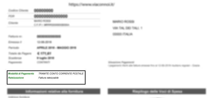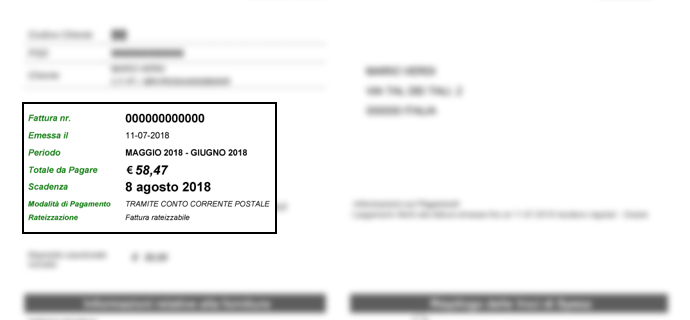 Qui trova i dati che identificano la fattura, con il numero di emissione, la data di emissione, il periodo di riferimento, il totale da pagare, la data di scadenza e la tipologia di pagamento scelta e se la fattura è rateizzabile.
